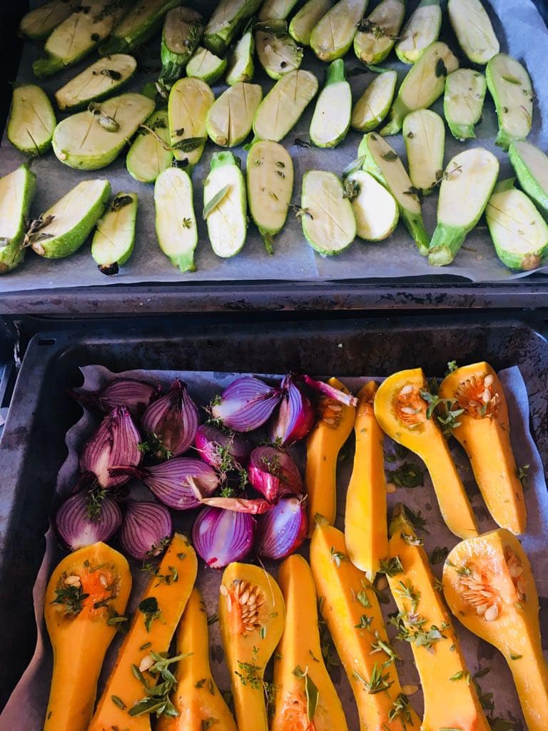 - בזמן הזה קולים את הירקות בתנור- מחממים תנור ל180 מעלות. שמים את כל הירקות בקערה, מעסים בשמן זית, מלח ים אטלנטי ואורגנו