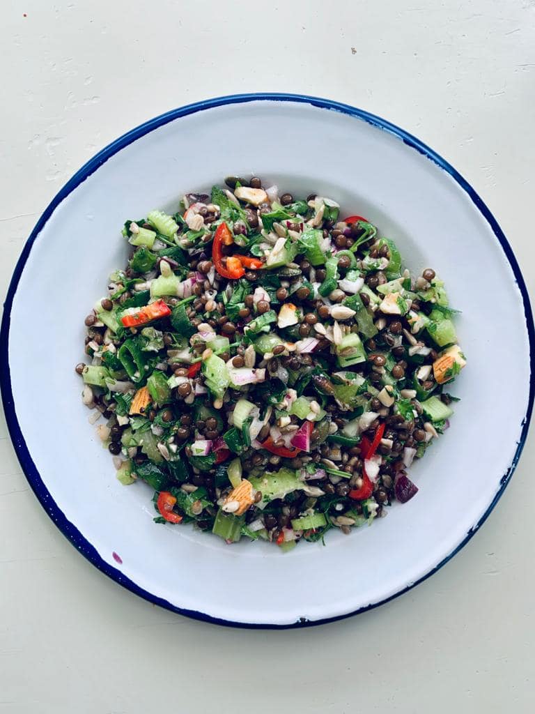 הסלט האהוב עלי- קראנצ'י, כיף ללעיסה, מרענן בזכות העלים הירוקים, ועשיר בחלבון איכותי מהצומח, סיבים וברזל- בזכות העדשים.