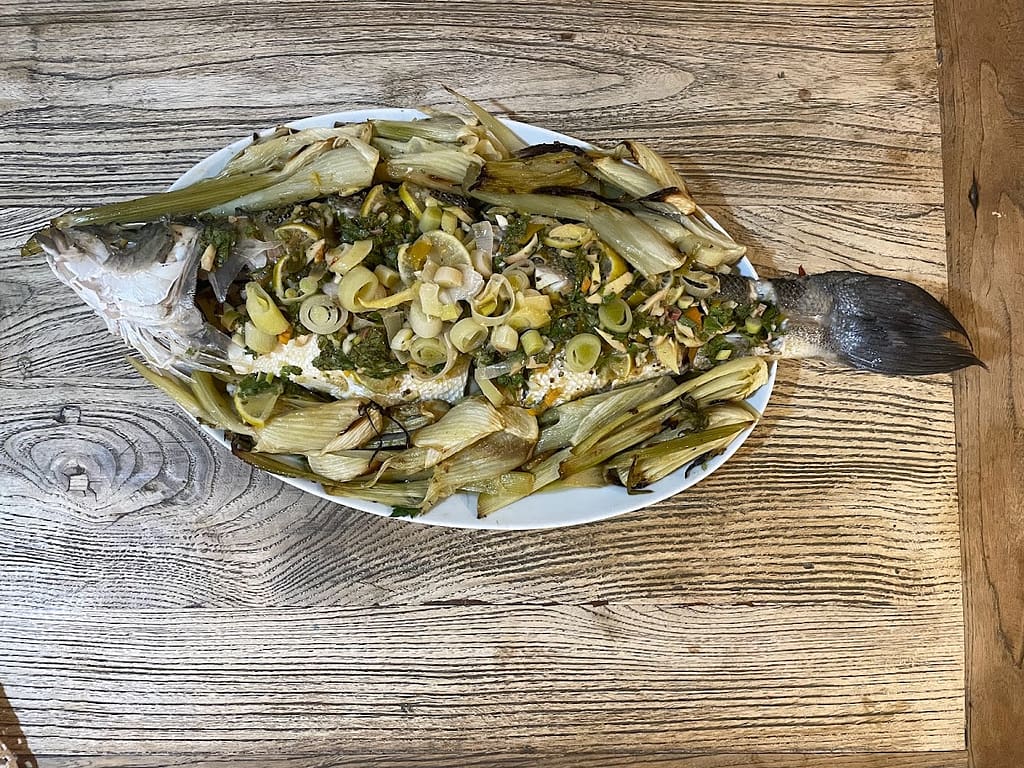 - מניחים בסלסלת קש פרוסות כרישה ואת הדגים מעליהם (אם משתמשים בבר ים שהוא דג גדול, חוצים אותו לשניים ושמים ב-2 סלסלות אידוי, אחת מעל השנייה)
