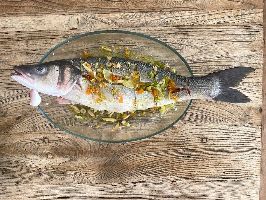 - עושים חריצים לאורכו של הדג משני הצדדים וממלאים את החריצים ואת פנים הדג בתערובת של עשבי תיבול ושמן זית, גרידת לימון, שום ופרוסות לימון. מתבלים במלח גס ומשרים במקרר עד ההכנה (לפחות למשך שעתיים)
