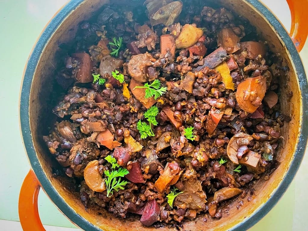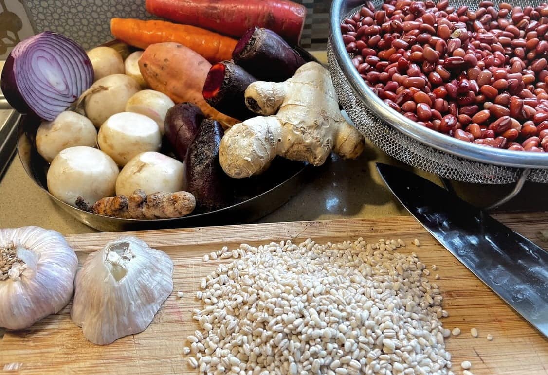 שעועית האזוקי היא שעועית יפנית קטנה אדומה, קלה לעיכול ועשירה בברזל ובחלבון איכותי מהצומח. בשילוב עם גריסי פנינה עשירים בסיבים תזונתיים ובירקות השורש מקנים לה מתיקות נפלאה. כל שצריך ליד זה סלט ירוק רענן עם מיץ לימון טרי לספיגה טובה של הברזל.