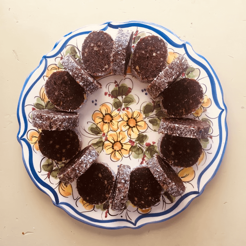 - מעבירים על קרש חיתוך מכוסה בנייר אפייה, מגלגלים לרולדה ארוכה, מצפים בקוקוס קלוי, מגלגלים בנייר אפייה ובניילון נצמד.