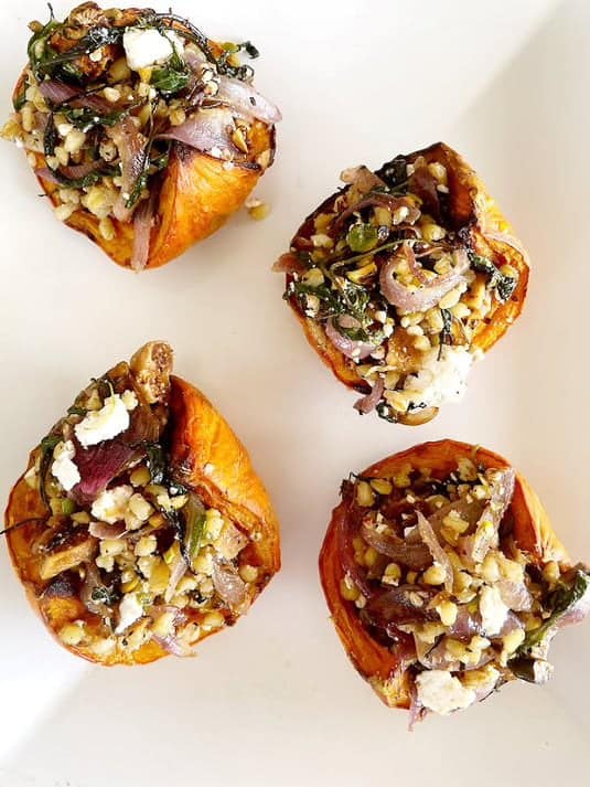 מנה צמחונית יפיפייה ומרשימה לאירוח. הדלעת הצלויה יחד עם סלט חיטה מתקתק, גבינת פטה כבשים, תרד ובצל מקורמל, משתלבים בצורה מושלמת, למנה ארץ ישראלית מקומית לתפארת.
