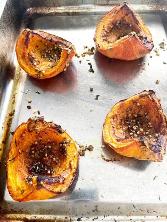 - בקערה קטנה מערבבים את התבלינים (זרעי הכוסברה, עשב התבלין ושבבי הצ'ילי) עם השמן זית (ללא הדבש והחומץ הבלסמי) ומורחים בעזרת מברשת את החלק הפנימי של הדלעות. מניחים על תבנית עם נייר אפייה ואופים עד ריכוך והשחמה של הדלעות, כ40 דקות.