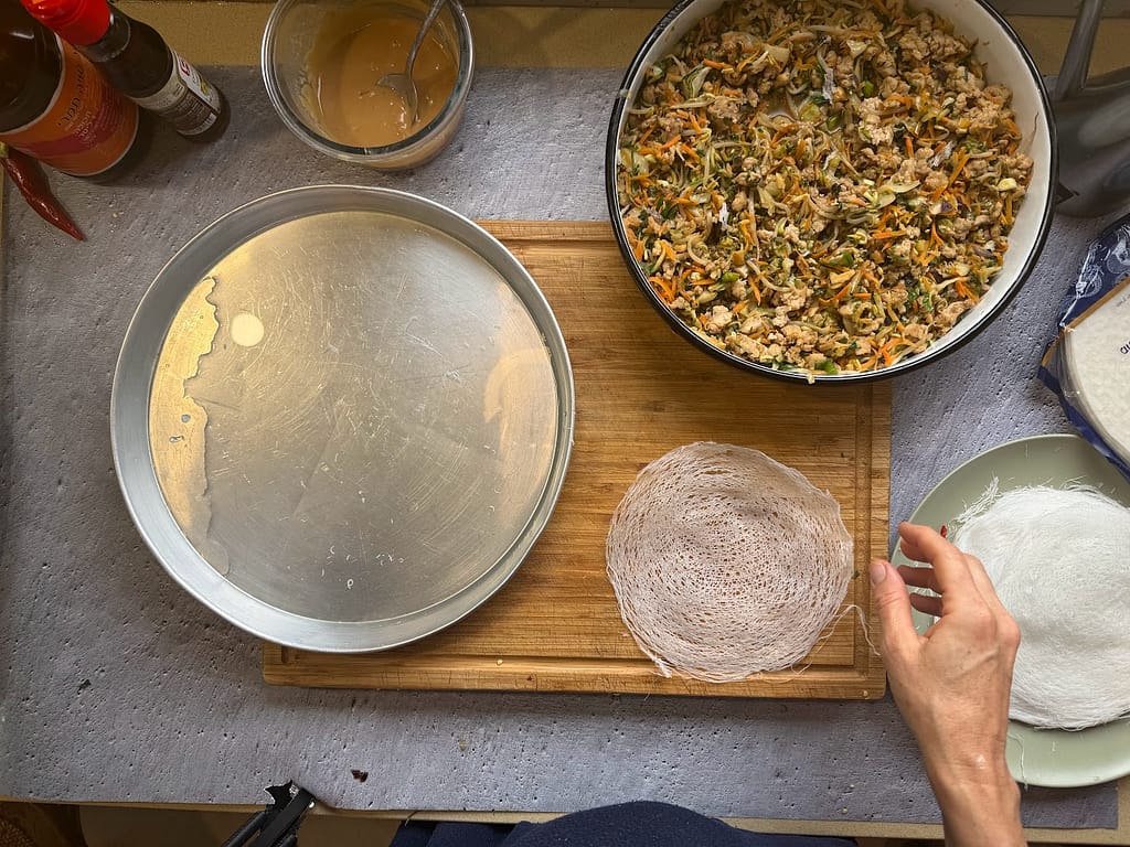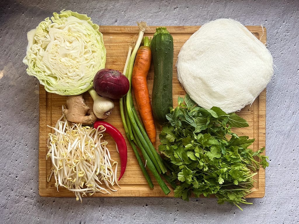 - מוציאים דפי האורז תחרה מהמקפיא ומפשירים בחוץ באריזה שלהם. בזמן הזה קוצצים את הבצל עם השום והג'ינג'ר ושמים בצד. מגרדים את הגזר, הקישוא והכרוב במעבד מזון או בפומפיה. קוצצים את עשבי התיבול הטריים והבצל הירוק ושמים בצד.