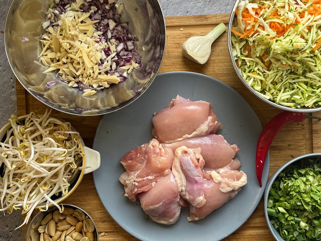 - מחממים מחבת רחבה / ווק עם כף שמן קוקוס ומקפיצים את הבצל, השום והג'ינג'ר לכמה דקות. מוסיפים את הפרגית/הטופו/הדג הטחון, מערבבים ומקפיצים לעוד מספר דקות. מוסיפים את הירקות המגורדים, סויה, לימון, סילאן ושמן השומשום, לעוד 2 דק' הקפצה. לא יותר כדי שהירקות ישמרו על המרקם הפריך שלהם. מוסיפים את עשבי התיבול הקצוצים, בצל ירוק, נבטים סיניים ובוטנים קצוצים, מערבבים היטב ומיד מסירים מהאש.