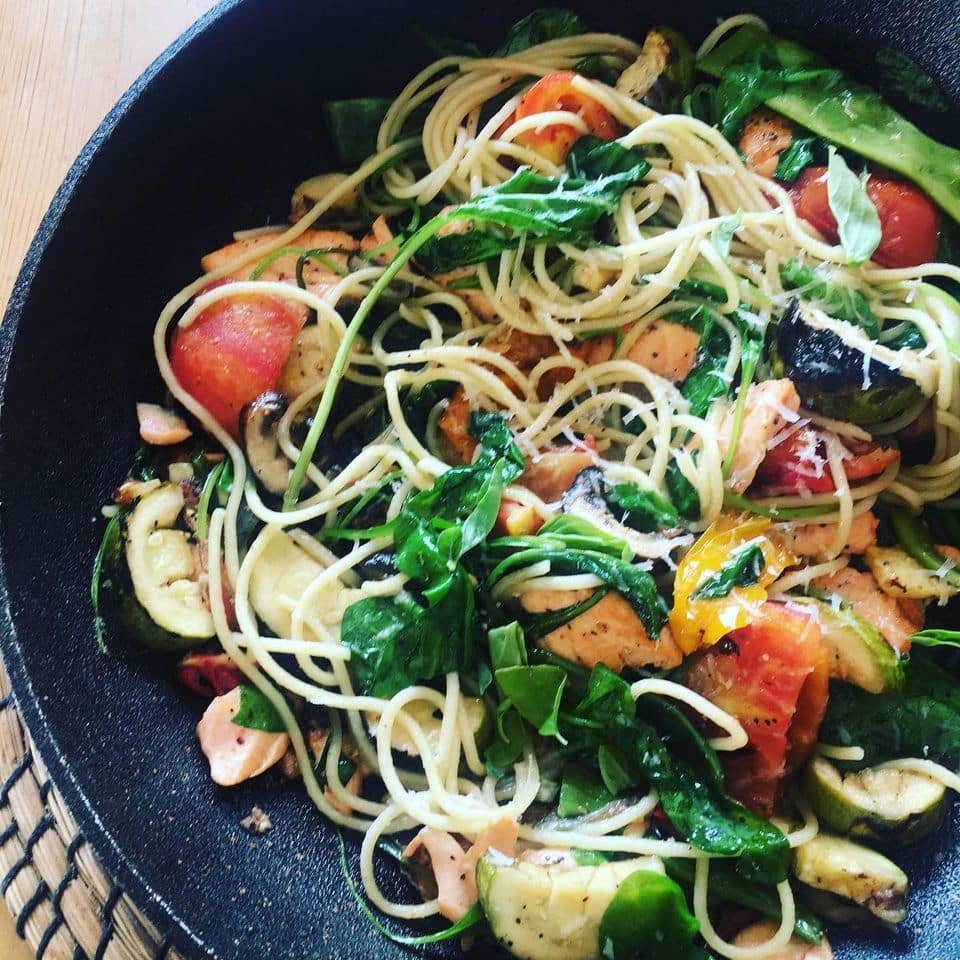 זו הדרך שאני אוהבת לאכול מנה של פסטה- מקפיצה ירקות עם שום, צ'ילי, שמן זית, רצועות סלמון, הרבה ירוקים, וקצת מהפסטה של הילדים