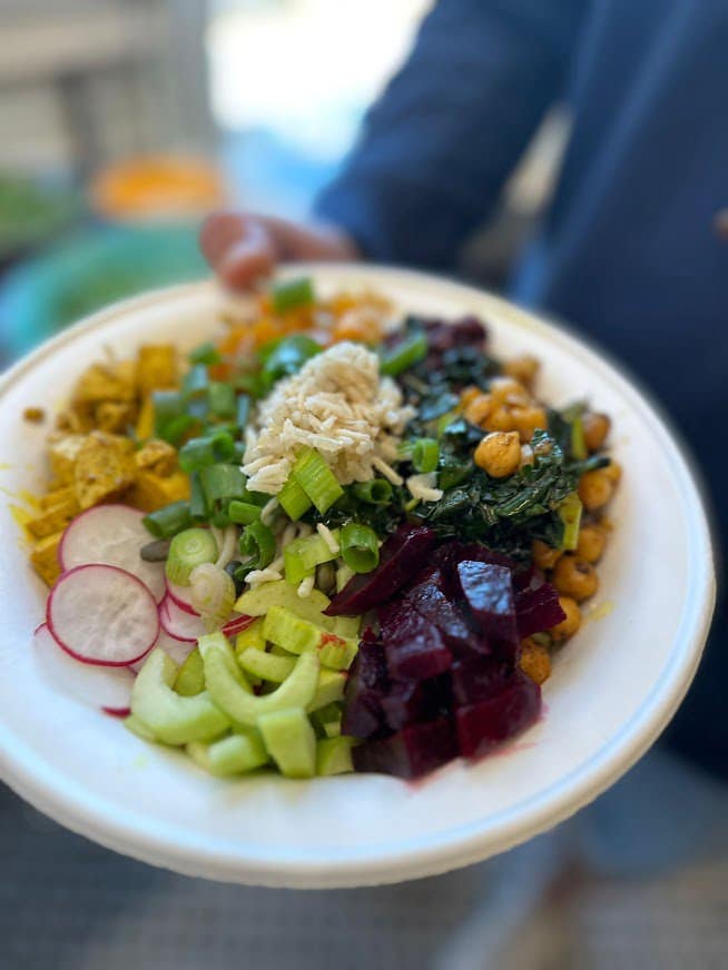 - Buddha bowl על בסיס אורז פרא, חומוסים, דלורית צלויה, קייל וירקות ברוטב טחינת סלק