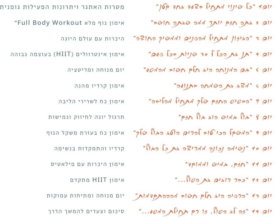 האתגר כולל: 14 ימים של תרגולי ספורט וכושר מונחים ומלווים על ידי מאמן כושר וריצה מנוסה ומוביל בתחומו, שבימים אלו משלים תואר דוקטורט בפיזיולוגיה של המאמץ, בעל מכוני כושר ותזונה.